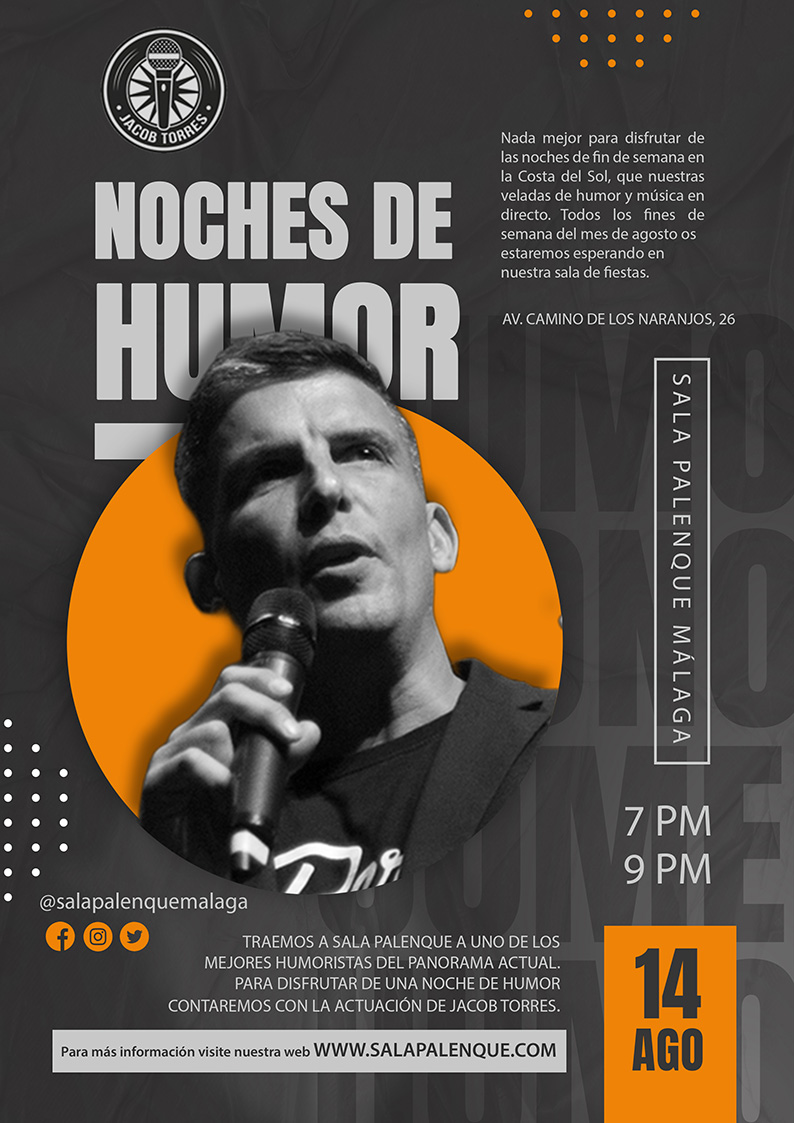 Jacob precisaba y deseaba tener una página web elegante, y para tal fin llegamos al acuerdo de combinar tonos anaranjados sobre negro. El resultado del desarrollo web es visible, con un aspecto muy estético y así lo aplicamos también para los diseños de los carteles de una serie de eventos que realizó recientemente en una conocida sala de fiestas de Málaga.